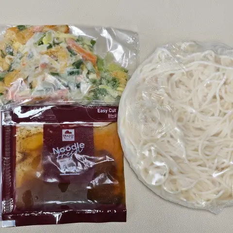 먼저, 부드러운 생면, 그리고 멸치 육수 베이스, 마지막으로 채소와 유부가 들어 있는 고명팩입니다.