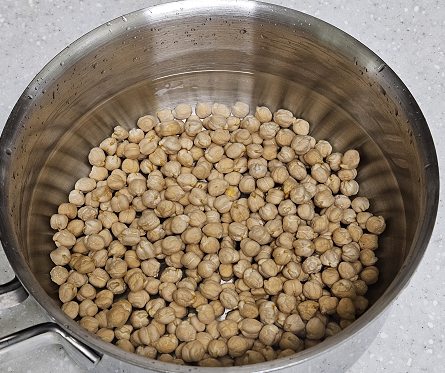 - 깨끗하게 씻은 병아리콩을 넉넉한 물에 담가 최소 8시간 이상 충분히 불려줍니다. 이때 물의 양은 병아리콩의 3~4배 정도로 넉넉하게 부어주세요. 병아리콩은 불리는 과정에서 수분을 흡수하여 부피가 2배 이상으로 늘어납니다.
